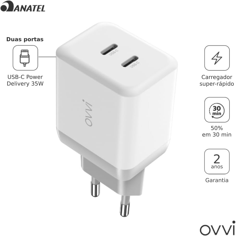 Itens Inclusos: 1 Carregador de Parede 35W Ovvi 2x USB-C Branco.