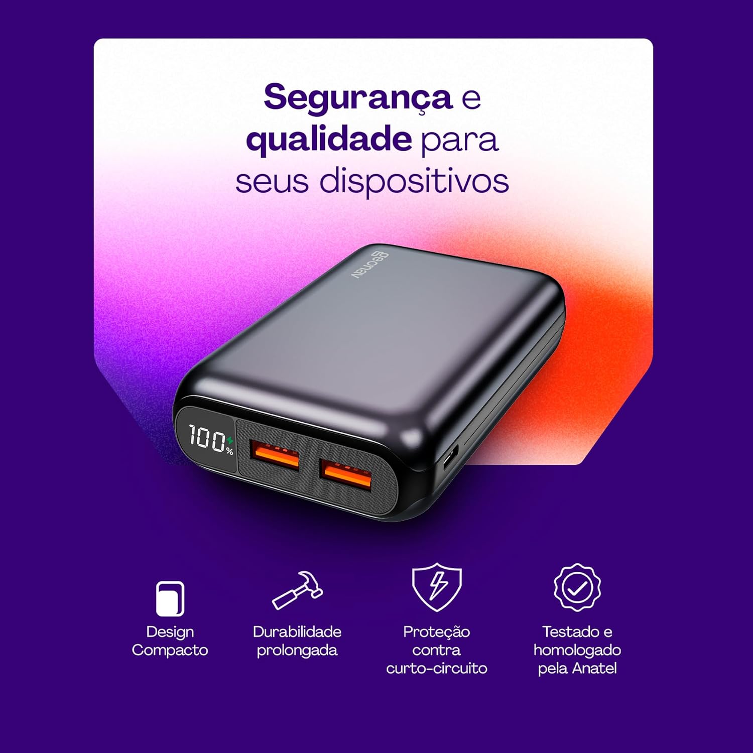 SEGURANÇA: Bateria de polímero de lítio de Grau A, a mais segura do mercado. Possui proteção contra sobrecarga, sobretensão, curto-circuito e superaquecimento. Produto homologado pela Anatel.