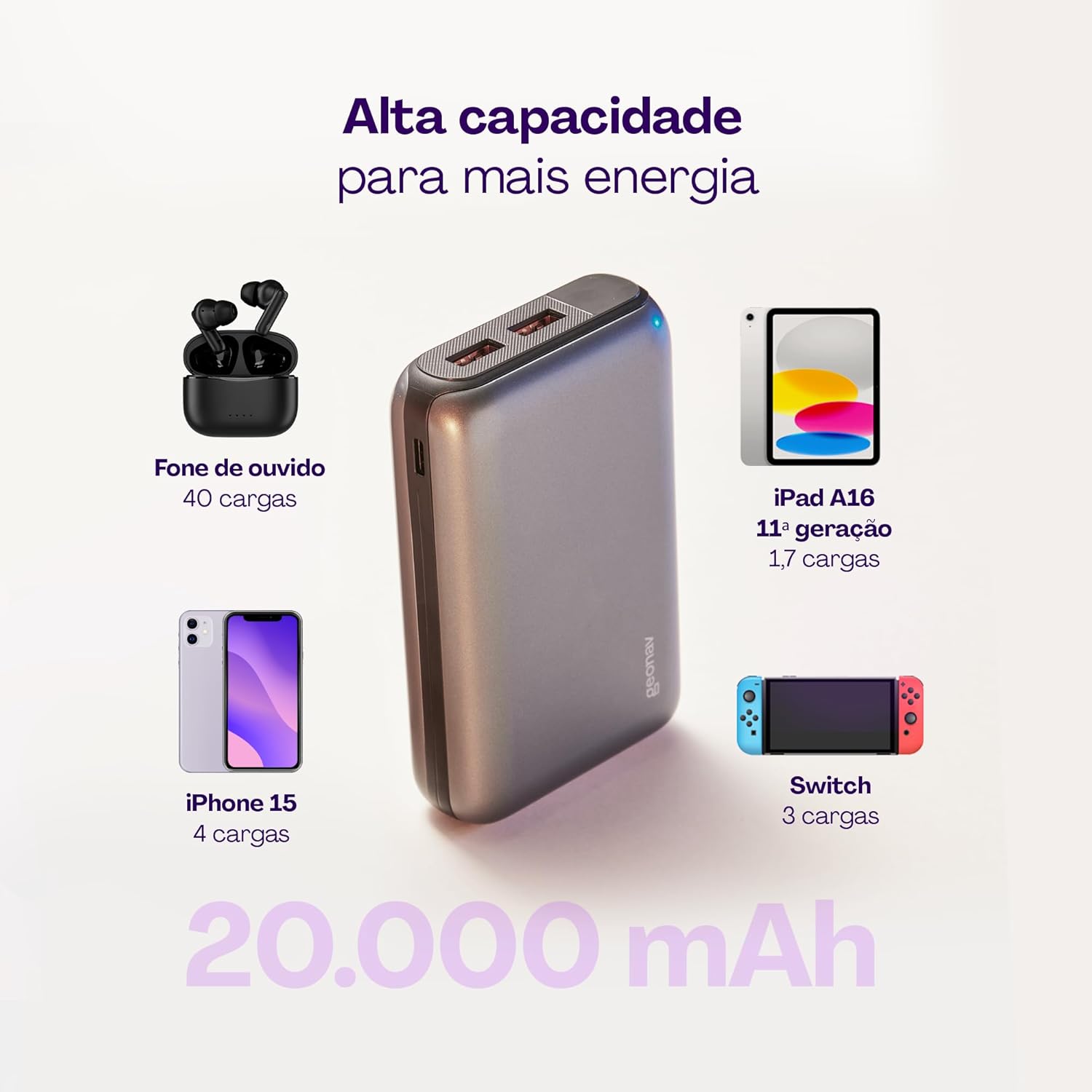 CARREGAMENTO RÁPIDO: O Power Bank Universal Compacto de 20.000 mAh da Geonav tem tecnologia Power Delivery 20W e Quick Charge 18W para carregamento rápido de dispositivos móveis, como smartphones Android e iOS. Em 30 minutos de carregamento, o dispositivo pode atingir até 50% de carga. Número de recargas completas variável por dispositivo.