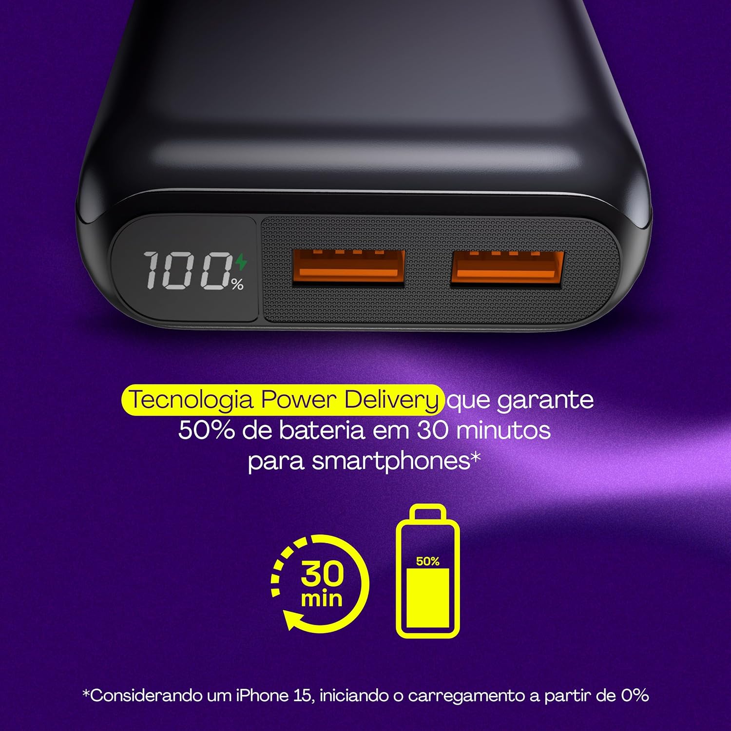COMPATIBILIDADE: Power bank universal com duas portas USB tipo A e uma porta USB tipo C. Pode ser usado para carregar qualquer dispositivo que tenha conexão USB-C e USB-A, como por exemplo smartphones Android e iPhone (incluindo iPhone 15), tablets, fones de ouvido, smartwatch entre outros. Carrega notebooks pequenos com potência de até 37W em menor velocidade.