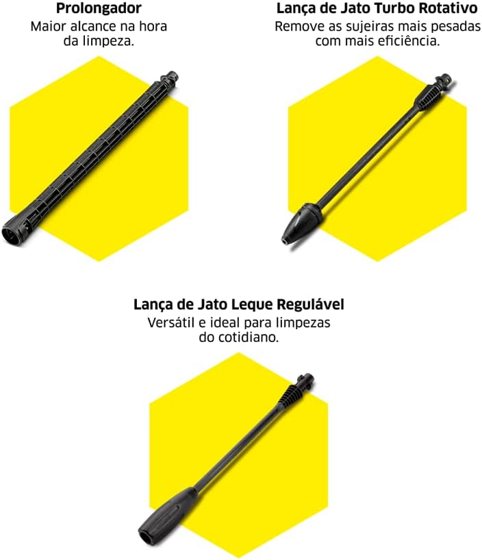 ” Pressão máxima de 1815 PSI: ótima para limpezas mais complexas e remoção de sujeiras encrustadas. Vazão de água de 360 litros por hora: maior agilidade na limpeza com máxima economia de água. Alça retrátil e rodas grandes: A única da categoria com alça retrátil, que permite que pessoas de todas as alturas transportem a máquina de forma confortável, além de facilitar o armazenamento. As rodas maiores evitam que a lavadora trave em degraus e buracos durante o uso. Canhão de espuma exclusivo Karcher: Produz uma espuma densa a um nível quase profissional, acessório já vem de série na máquina. Bico articulado 360°: ajustável de acordo com a necessidade