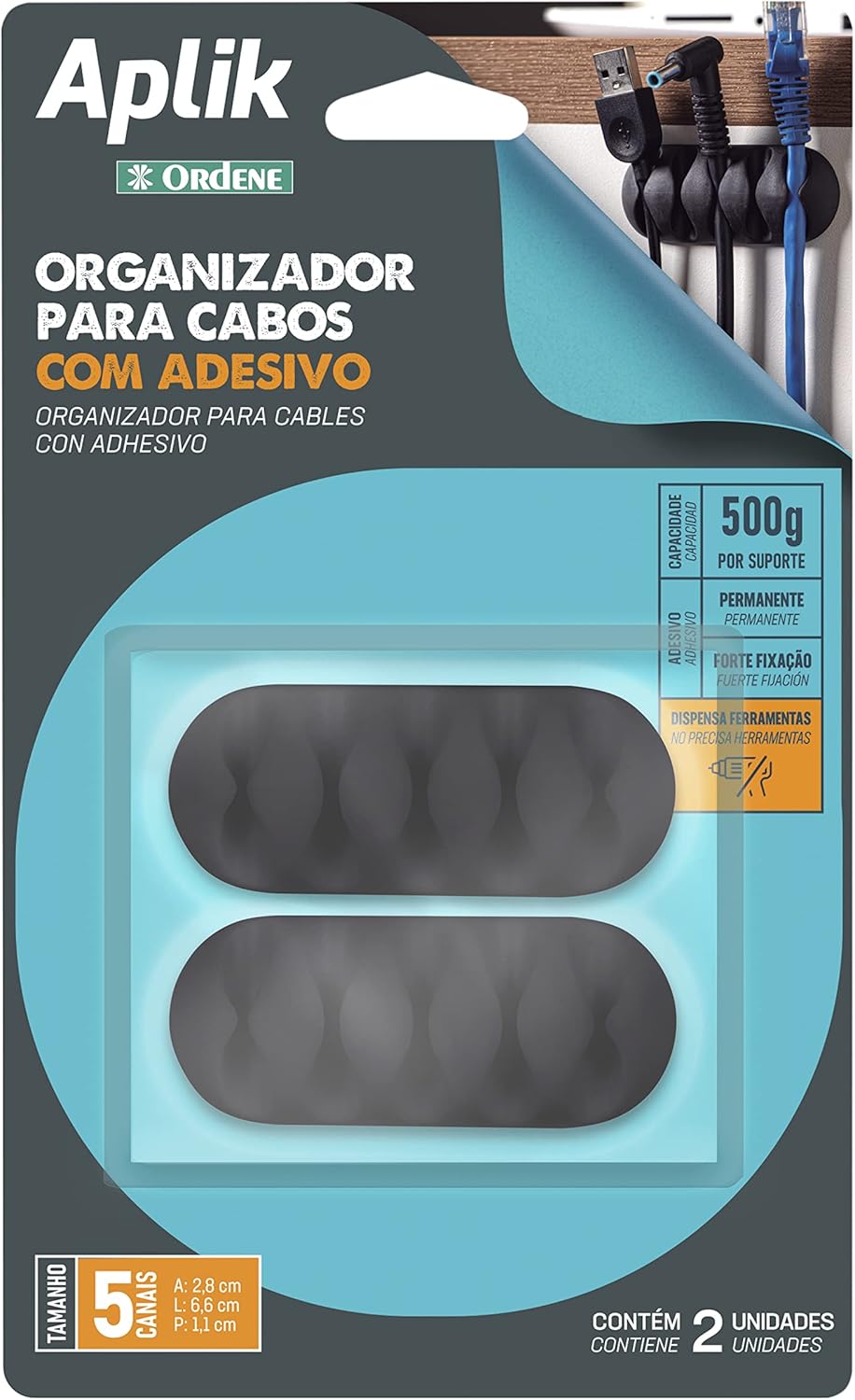 | Nome do Tipo de Produto | Organizador para Cabos Emborrachado para até 5 Cabos, com Adesivo, Cor Preta, Linha Aplik, Ordene. |