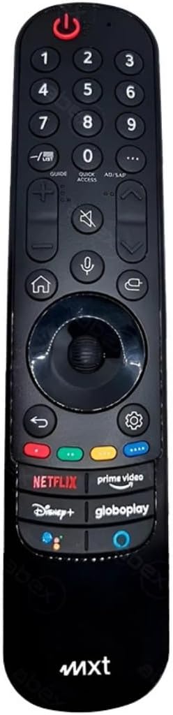 Apresentamos o Controle Smart Magic MXT, um controle remoto avançado projetado especificamente para TVs LG com função Magic. Este dispositivo inteligente oferece uma experiência de navegação intuitiva e moderna, equipado com microfone interno para comandos de voz, permitindo que você controle sua TV de forma natural e conveniente. O controle possui teclas de acesso rápido para suas plataformas de streaming favoritas, incluindo Netflix, Prime Video, Disney+ e Globoplay, além de acesso direto ao navegador Google. Com design ergonômico e acabamento em preto elegante, o controle oferece teclado numérico completo e botões de navegação bem posicionados. A conectividade é simplificada, tornando a configuração e o uso diário práticos e sem complicações. Este controle é a escolha perfeita para quem busca uma solução completa para controlar sua TV LG, combinando funcionalidade avançada com facilidade de uso.