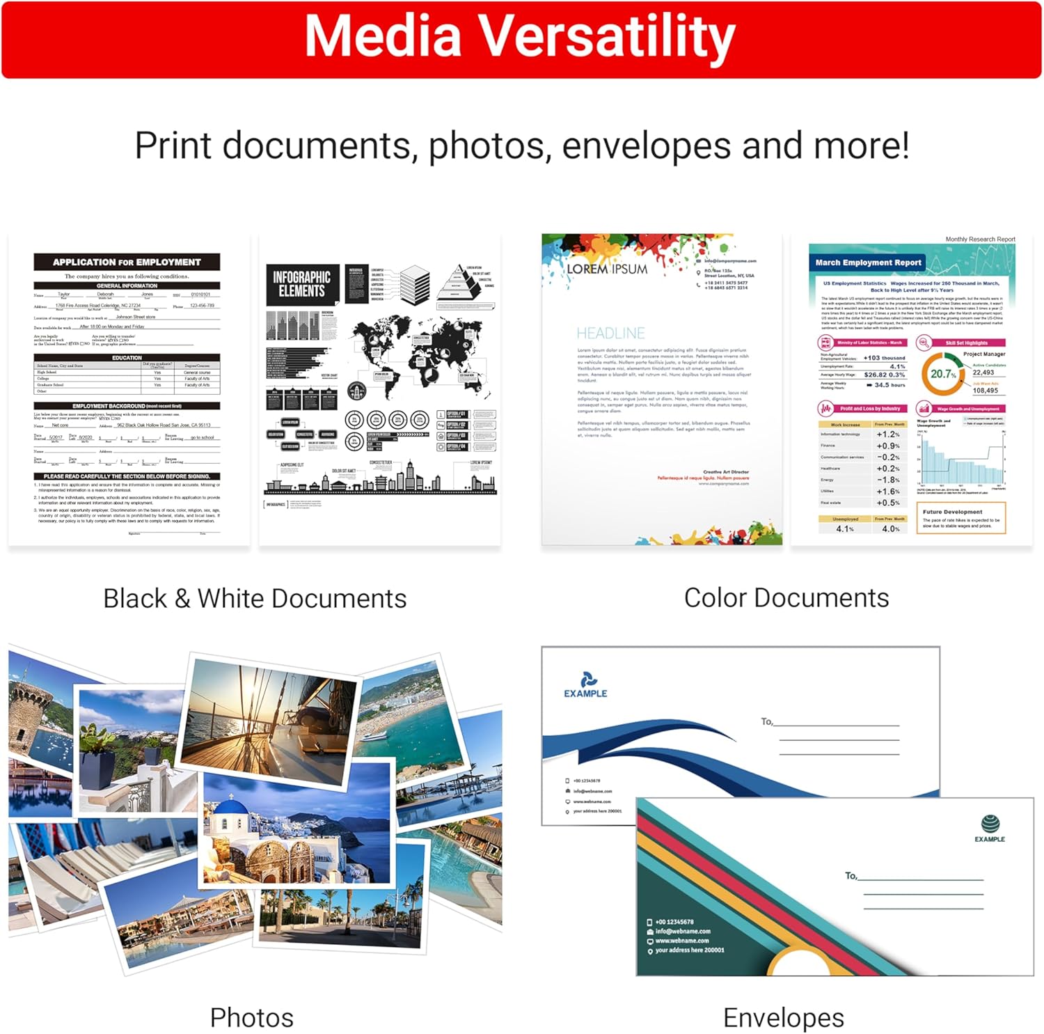 Suporte de mídia diversificada – imprima uma ampla variedade de documentos e fotos de até 21,6 cm x 28 cm, com ou sem bordas, para todas as suas necessidades criativas e profissionais