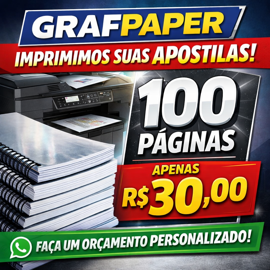 Este anúncio refere-se à impressão de 100 páginas de apostila, com acabamento profissional, ideal para estudos, cursos, treinamentos e materiais educacionais.