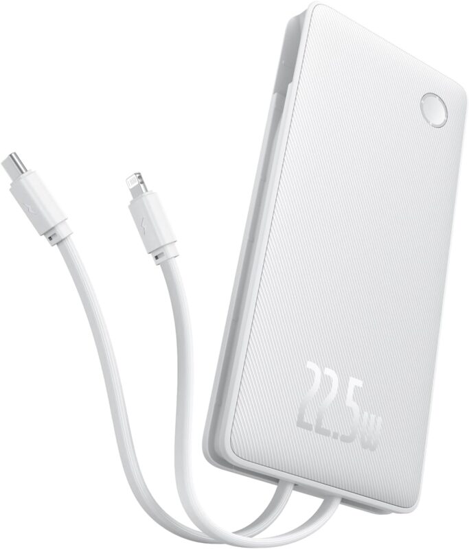 Basike Power Bank, Carregador Portátil Universal 10000mAh, USB-A(até 22.5W)+USB-C(até 20W) com 3 Cabos Integrados (USB-C, USB, Lightning) Carregamento Rápido, Led Indicador de Bateria (Branco)