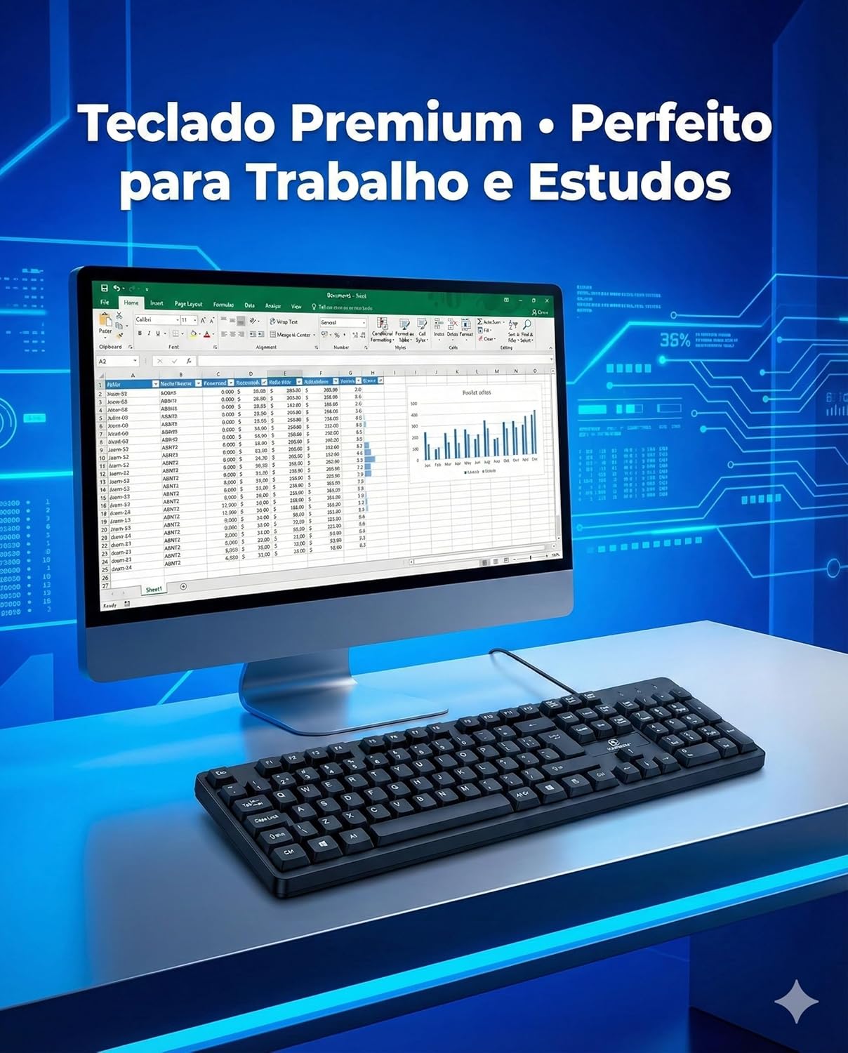 Teclado com Fio USB ABNT2 para PC e Notebook – Digitação Silenciosa, Conforto Ergonômico, Perfil Slim, Teclas Macias, Plug & Play, Alta Durabilidade, Ideal para Escritório, Estudos e Uso Diário